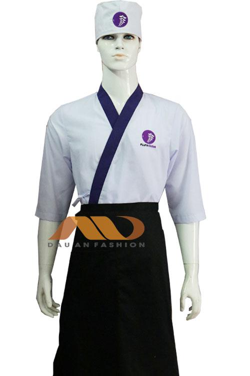 Đây là mẫu áo tái hiện thành công hình ảnh đầu bếp trong các nhà hàng lớn ở Nhật. Màu trắng của áo mang lại sự phóng khoáng và nam tính. Với đầu bếp, màu áo trắng là màu áo bếp truyền thống và chuyên dụng.